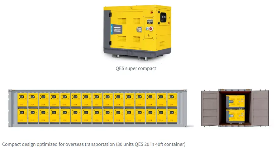 โมเดล QES ขนาดกะทัดรัดเป็นพิเศษได้รับการออกแบบเพื่อให้การขนส่งมีประสิทธิภาพสูงสุด คุณสามารถใส่ Atlas Copco QES 20 ได้สูงสุด 30 เครื่องในคอนเทนเนอร์ขนาด 40 ฟุต ซึ่งมากที่สุดสำหรับ Atlas Generator ขนาด 20kVA ในตลาด! หมายถึงการขนส่งที่ได้รับการปรับปรุง ลดการปล่อย CO2 และต้นทุนการดำเนินงาน ซึ่งส่งผลให้ต้นทุนรวมในการเป็นเจ้าของ (TCO) ลดลง การออกแบบที่เป็นมิตรกับสิ่งแวดล้อมทำให้เหมาะสำหรับการจัดเก็บในต่างประเทศ ซึ่งช่วยลดพื้นที่การติดตั้งของคุณที่ไซต์งานได้อย่างมาก