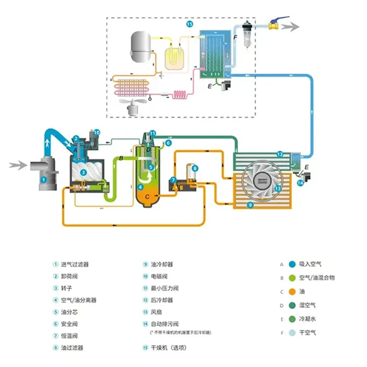 2. ระบบเสริม: รวมถึงระบบน้ำมันหล่อลื่น, ระบบน้ำหล่อเย็น, ระบบควบคุมไฟฟ้า ฯลฯ ถูกนำมาใช้เพื่อให้แน่ใจว่าเครื่องอัดอากาศทำงานตามปกติ
