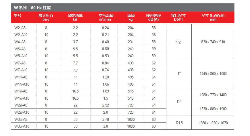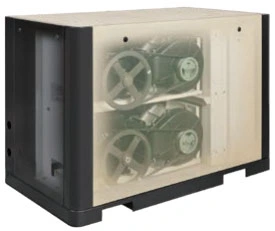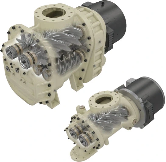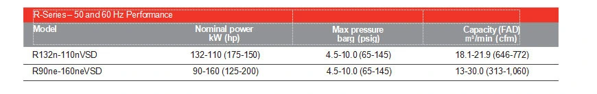 การอัดอากาศแบบขั้นเดียวและแบบสองขั้นระดับโลก (แบบสองขั้นเริ่มต้นที่ 90 กิโลวัตต์) พร้อมด้วยการเหนี่ยวนำ TEFC หรือมอเตอร์ปรับความเร็วได้ซึ่งเป็นอุปกรณ์เสริมช่วยลดการใช้พลังงาน