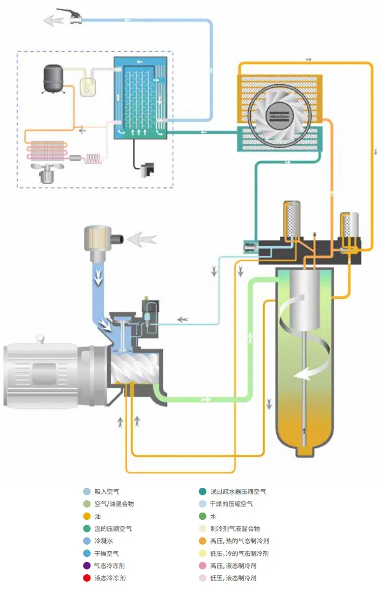 · เครื่องแยกน้ำในอาฟเตอร์คูลเลอร์สามารถขจัดน้ำโดยทั่วไปได้ มาพร้อมกับวาล์วระบายน้ำแบบอิเล็กทรอนิกส์เป็นมาตรฐานเพื่อให้ระบายน้ำอัตโนมัติและลดการสูญเสียอากาศอัด