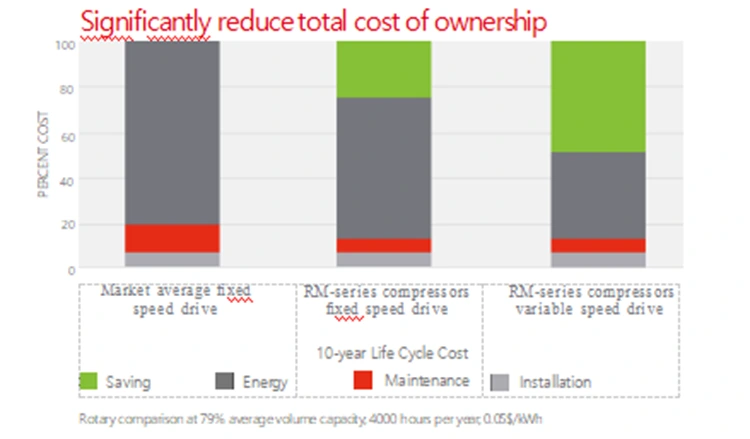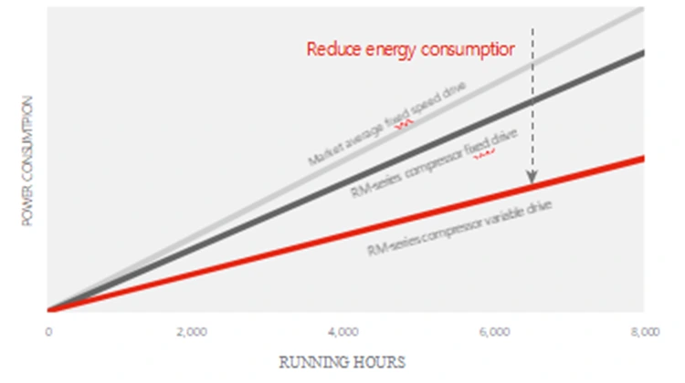 เราได้พัฒนาซีรีย์ RM ใหม่โดยใช้ยูนิตคอมเพรสเซอร์ที่ล้ำสมัย ซึ่งออกแบบมาเพื่อมอบประสิทธิภาพที่เหนือกว่าให้กับคุณ ด้วยโปรไฟล์โรเตอร์ที่ได้รับการปรับปรุงและการปรับปรุงอื่นๆ ชุดคอมเพรสเซอร์ใหม่จึงมีประสิทธิภาพเพิ่มขึ้น 11% และลดต้นทุนการดำเนินงานลงอย่างมาก นอกจากนี้ โปรไฟล์โรเตอร์ใหม่ยังให้ความจุอากาศในอุดมคติ ซึ่งสูงกว่ารุ่นก่อนหน้าถึง 11% อัตราส่วนกำลังต่อน้ำหนักที่ลดลงหมายถึงต้นทุนการลงทุนด้านอุปกรณ์และการใช้พลังงานที่ลดลง ซึ่งจะช่วยลดต้นทุนการเป็นเจ้าของทั้งหมดของคุณ