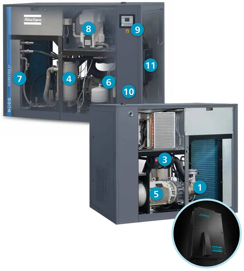การใช้พลังงานของคอมเพรสเซอร์คิดเป็นสัดส่วนมากกว่า 70% ของต้นทุนตลอดอายุการใช้งาน และการผลิตอากาศอัดต้องใช้มากกว่า 40% ของค่าไฟฟ้าทั้งหมดของโรงงาน เพื่อลดการใช้พลังงาน Atlas Copco ได้พัฒนาเครื่องอัดอากาศแบบหล่อลื่นแบบไม่ใช้น้ำ VSD เทคโนโลยี VSD ไม่เพียงแต่ช่วยประหยัดพลังงานได้มาก แต่ยังปกป้องสิ่งแวดล้อมสำหรับคนรุ่นอนาคตอีกด้วย ด้วยการลงทุนอย่างต่อเนื่องในเทคโนโลยีนี้ Atlas Copco จึงนำเสนออากาศที่ขับเคลื่อนด้วยความเร็วรอบได้ (VSD) ที่หลากหลาย คอมเพรสเซอร์ในตลาด