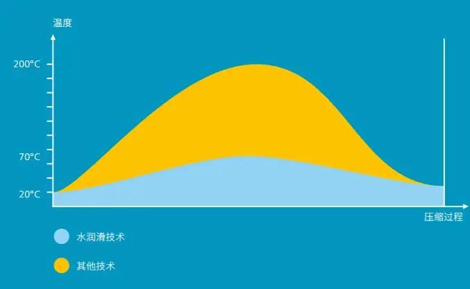 น้ำมีพลังการทำความเย็นที่ยอดเยี่ยมและขจัดความร้อนออกจากแหล่งกำเนิดได้อย่างมีประสิทธิภาพ พลังงานสิ้นเปลืองที่เกิดจากการสร้างความร้อนจะถูกกำจัด และสามารถผลิตอากาศอัดได้มากขึ้นต่อพลังงานหนึ่งกิโลวัตต์ อากาศอัดที่เย็นกว่าจะช่วยลดความเครียดจากความร้อนบนส่วนประกอบ จึงช่วยยืดอายุการใช้งาน
